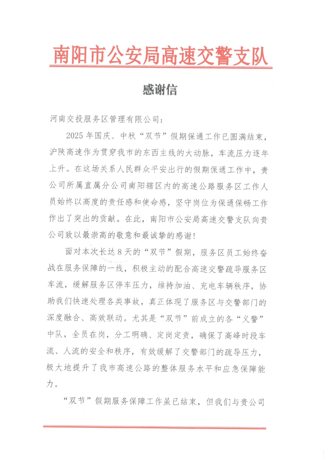 《一封感謝信 濃濃服務…》 10月10日,南陽市公安局高速交警支隊向公司所屬直屬分公司寄來感謝信,表達對南陽轄區(qū)內(nèi)…